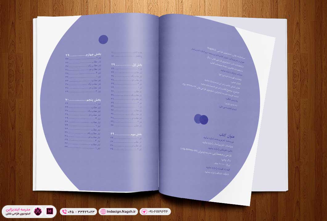 - لایوت تمامی صفحات یک کتاب از قبیل صفحه بسم الله، شناسنامه، فهرست و … در این نمونه طراحی شده است.